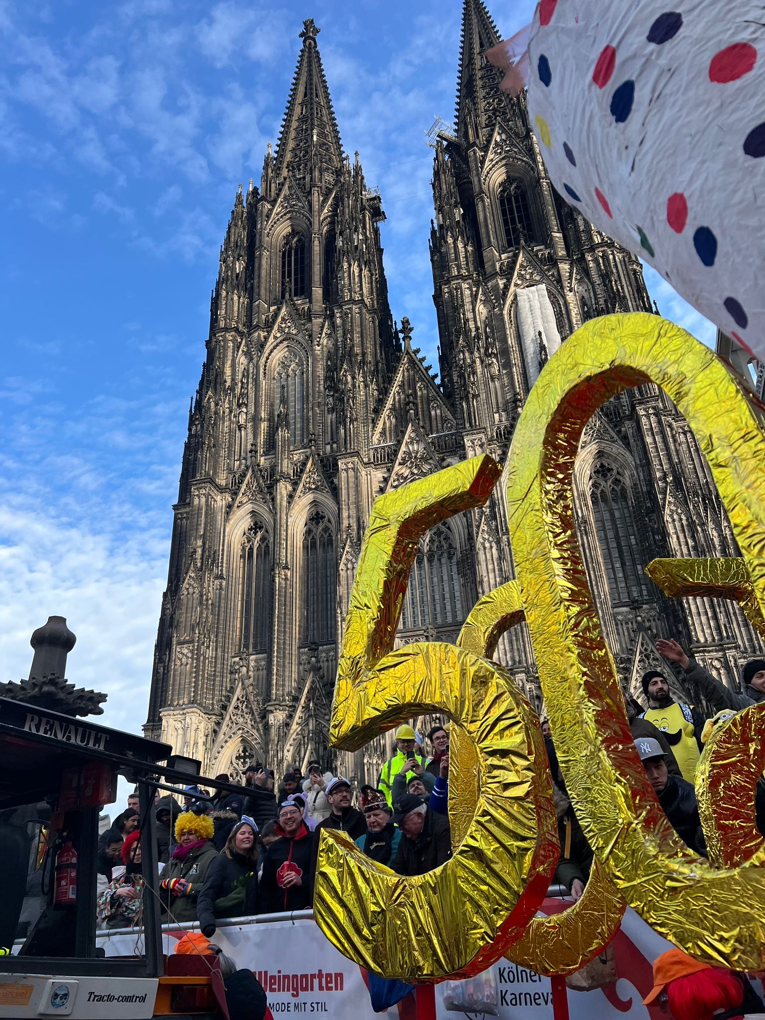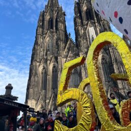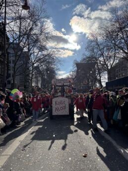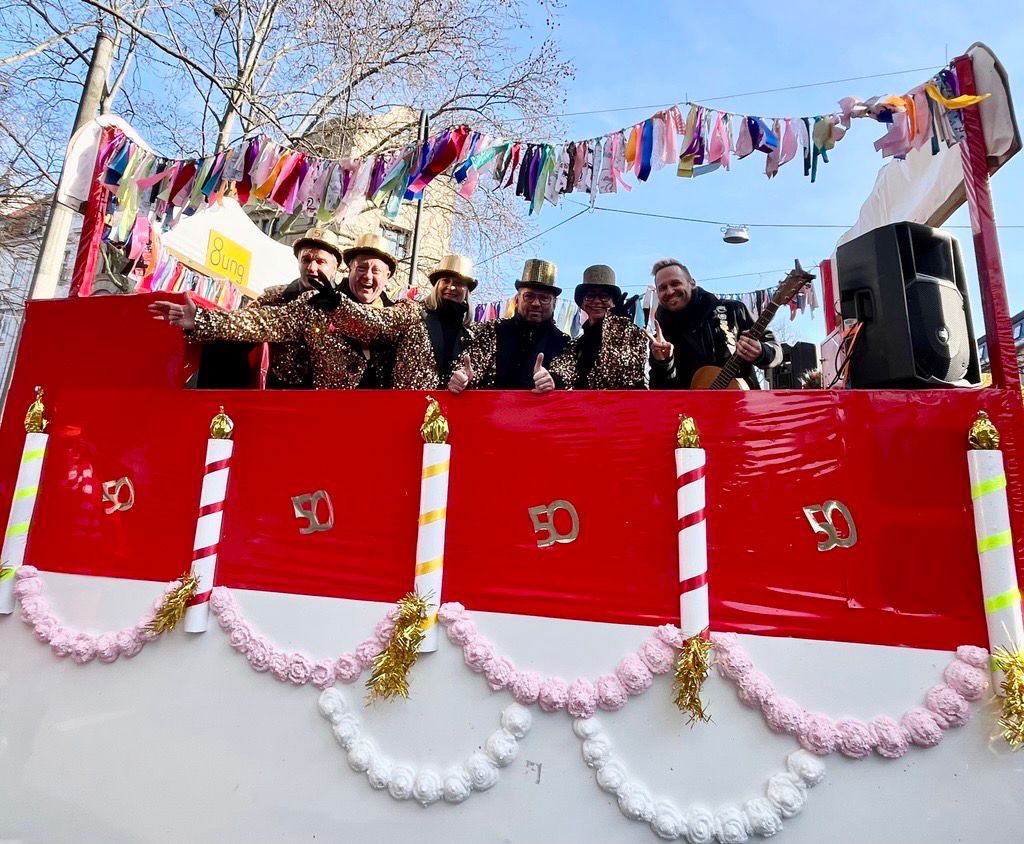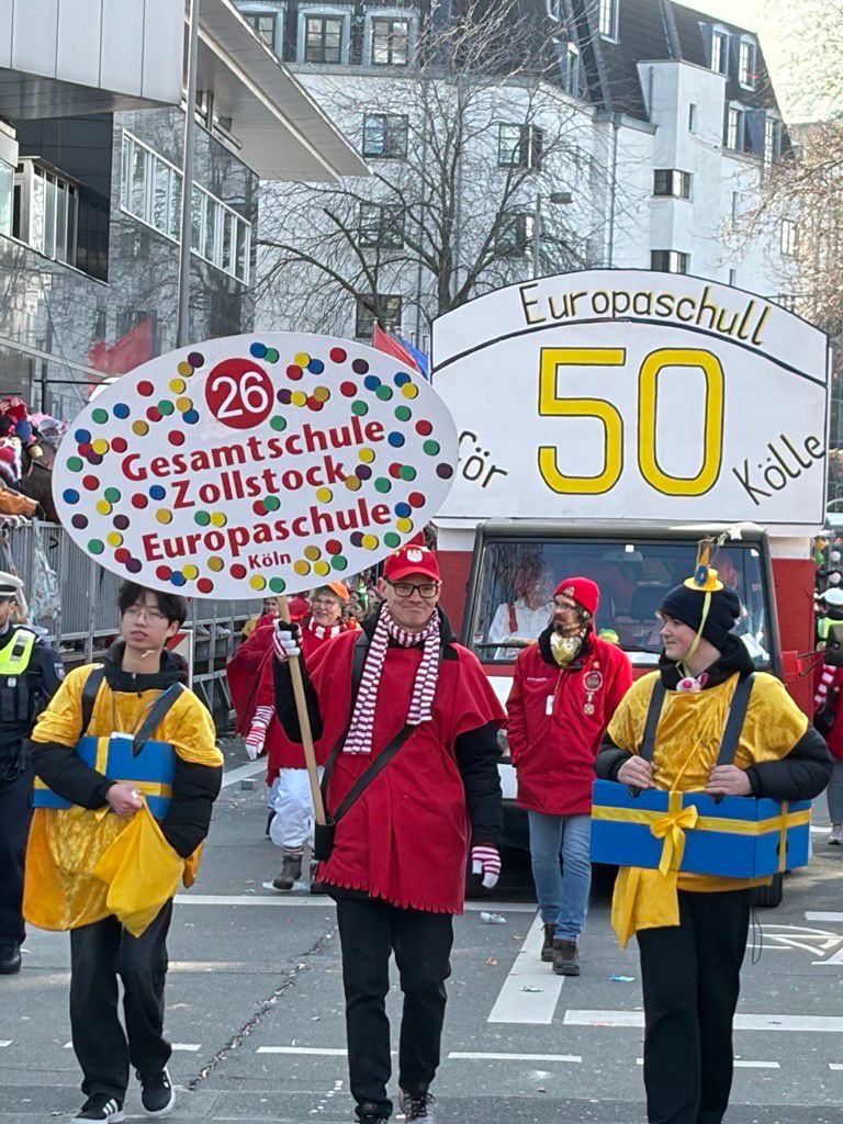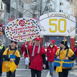 Am Karnevalssonntag stand als nächstes Highlight die Teilnahme an den Schull- und Veedelszöch auf dem Programm, bei der natürlich das Jubiläum der ESK mit dem Motto „Europaschull – 50 Johr för Kölle“ im Mittelpunkt stand. Die monatelange Arbeit der Planer:innen, Wagenbauer:innen und Kostümnäher:innen zahlte sich aus: Mit Kamelle, Musik und viel Tschingderassabumm zog unsere Schulgemeinde durch die Straßen und feierte sich selbst – und das völlig zu Recht!